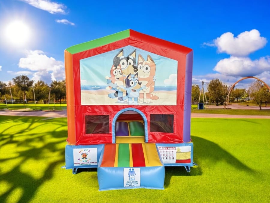 Get ready to elevate your backyard party or event with the Bluey Mini 2.5mx2.5m jumping castle, a vibrant and engaging inflatable designed to fit even the smallest yards. Perfect for ensuring non-stop entertainment, this rainbow-colored jumping castle features a built-in basketball hoop and a protective sun/shower cover, keeping children safe from the elements while they play. Easy Booking and Setup Process Booking the Bluey Mini jumping castle couldn't be easier! Simply select this exciting inflatable online, follow our straightforward booking process, or reach out to us directly at 0422-985-798 for any queries. You'll enjoy a maximum of 6 hours of hire, complete with a soft mat and ground mat at no extra charge. All that's required is a standard power source (1x 240v/10amp) within 20 meters of the setup area, and clear access that's at least 1 meter wide. Please note if there are any steps, include this in your booking notes with the number of steps. Trust in Our Professional Services Rest assured, House 2 Bounce holds Public Liability Insurance, and we can provide a Certificate of Currency to venues and council areas upon request. For those without a power supply nearby, we offer generator rentals for an additional charge, as well as the option to have our team supply supervisors for added peace of mind. Convenient Delivery Across Sydney Enjoy free delivery in postcodes 2137 and 2138, with minimal additional charges ranging from $10-$60 for locations outside this range. Whether you're in the Inner West, Metropolitan Sydney, Eastern Suburbs, Northern Suburbs, North West Suburbs, South East Suburbs, or the Sutherland Shire, Bluey Mini 2.5mx2.5m jumping castle in Jumping Castle in Inner West, Jumping Castle in Metropolitan Sydney, and beyond, is ready to bring joy to your event! Simply enter your address during booking, and we’ll calculate any applicable fees. Transform your event into a magical adventure with the jumping castle Bluey Mini 2.5mx2.5m, an unbeatable choice for fun and excitement! Contact us today to secure your booking.