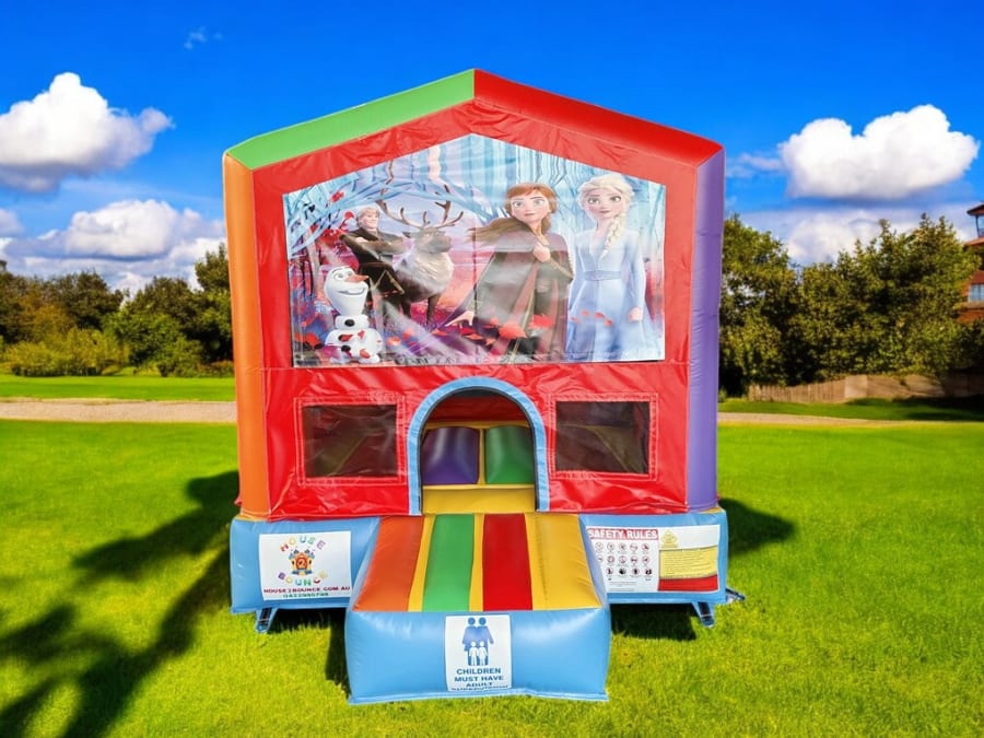 Jumping Castle Frozen Mini. Perfect for Small Yards! Transform your backyard into a magical playland with the Jumping Castle Frozen Mini! Designed to fit even the smallest of yards, this vibrant, rainbow-hued attraction is sure to captivate children and keep them entertained for hours. Featuring an integrated basketball hoop and a sun/shower cover, this castle ensures kids enjoy nonstop fun, come rain or shine! Why Choose the Jumping Castle Frozen Mini Eye-Catching Design: Its colorful appearance makes it a standout addition to any event. Basketball Hoop: Boosts engagement and adds an extra layer of excitement. Sun/Shower Cover: Offers protection from harsh sun rays and unexpected showers. 6-Hour Hire: Enjoy extended playtime with no additional costs. Safety First: Comes with public liability insurance and a Certificate of Currency for peace of mind. Book Your Jumping Castle in Inner West, Sydney, Eastern Suburbs, Northern Suburbs, North West Suburbs, South East Suburbs & Sutherland Shire Booking is simple and hassle-free. Just select the castle online and follow our straightforward booking process. If you have any questions or special requirements, don't hesitate to contact us at 0422-985-798. Convenient Setup and Delivery For powering the castle, ensure you have a standard power source (1x 240v/10amp) within 20 meters of the setup area. A minimum of 1m wide clear access with no steps is required, but if steps are present, please specify in the booking notes. Enjoy free delivery for postcodes 2137 & 2138. For areas outside this range, additional delivery charges (up to $60) apply based on distance. Enter your address during booking to calculate exact delivery fees. Elevate your event with the House 2 Bounce Jumping Castles and create unforgettable memories for your little ones today!