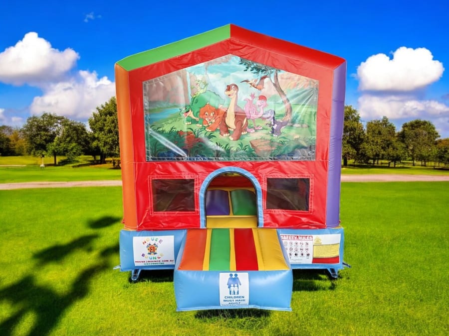 Unleash Fun and Adventure with the Jumping Castle Dinosaur Mini Transform your backyard into a prehistoric playground with the Jumping Castle Dinosaur Mini, a vibrant, rainbow-colored inflatable that promises fun-filled entertainment for kids. Designed to fit even the smallest of yards, this eye-catching jumping castle is perfect for parties and events in Inner West, Metropolitan Sydney, Eastern Suburbs, Northern Suburbs, North West Suburbs, South East Suburbs & Sutherland Shire. Bring the excitement of a bouncy adventure right to your home! Features That Kids Will Love Vivid Rainbow Design: Captures the imagination of young adventurers. Basketball Hoop: Adds an extra layer of fun and challenge. Sun/Shower Cover: Ensures playtime continues rain or shine. Enjoy up to 6 hours of non-stop bouncing fun with your Jumping Castle Dinosaur Mini! The package includes a soft mat and ground mat at no extra charge, ensuring safety and comfort for all little jumpers. Simple Booking and Convenient Setup Booking your jumping castle is a breeze. Simply select the castle online and follow the easy booking process. If you have any questions, our friendly team is just a call away at 0422-985-798. We require a standard 240v/10amp power supply within 20 meters and clear access to the setup area. If your location has steps, please let us know during booking. Delivery and Insurance Coverage We offer free delivery for postcodes 2137 & 2138, with minimal delivery charges for other areas. We proudly serve families in Inner West, Sydney, Eastern Suburbs, Northern Suburbs, North West Suburbs, South East Suburbs & Sutherland Shire. House 2 Bounce is fully insured with Public Liability Insurance, and we can provide certificates upon request for venues and council areas. Book the Jumping Castle Dinosaur Mini today and let the giggles and excitement begin!