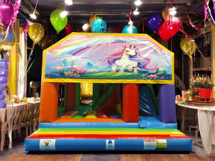 Unleash Joy with the Vibrant Unicorn Jumping Castle. Transform any event into a magical adventure with the Unicorn Jumping Castle. Bursting with rainbow colors, this eye-catching inflatable is a delight for both children and adults. Whether it's a birthday party, festival, or community event, this castle guarantees maximum fun and entertainment.