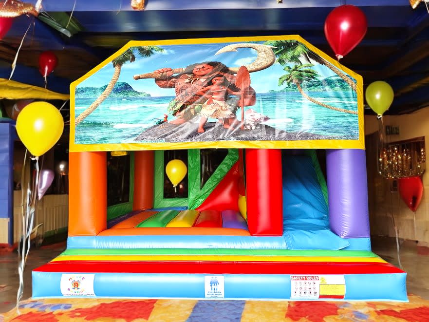 Unleash the Fun with the Moana Jumping Castle Open 5mx5m Jumping Castle. Transform any event into a magical adventure with the Moana Jumping Castle Open 5mx5m. Perfectly crafted with vibrant rainbow colors, this eye-catching jumping castle isn't just about bouncing fun—it's an experience! Designed for both children and adults, it's a fantastic addition to any party or gathering.
